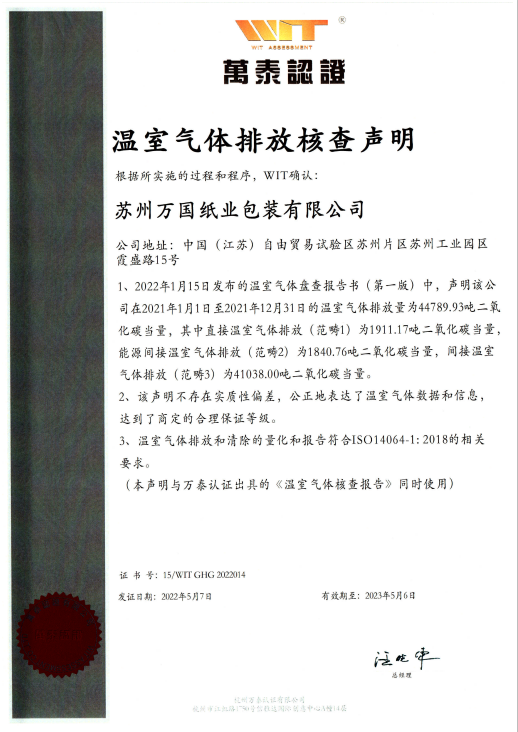 2022年公司邀請了第三方服務(wù)機構(gòu)杭州萬泰認(rèn)證有限公司對溫室氣體碳排放情況進行了盤查,更進一步驗證了碳排放數(shù)據(jù)核算的完整性和準(zhǔn)確性。公司順利通過并取得了ISO14064-1:2018碳排放證書。